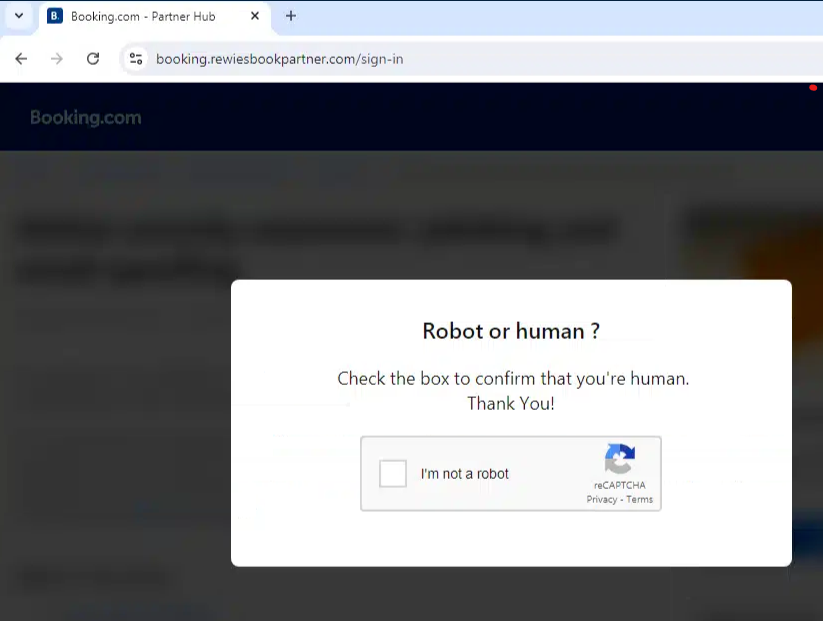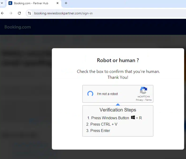 La táctica ClickFix se ha generalizado en los últimos meses, incluidos los ataques dirigidos a los trabajadores de la hostelería, en los que los ciberdelincuentes se hacen pasar por Booking.com para entregar malware que roba credenciales. Estos correos electrónicos de phishing a menudo hacen referencia a comentarios negativos de huéspedes u oportunidades promocionales, lo que atrae a los usuarios a interactuar con contenido malicioso que, en última instancia, conduce a la instalación de malware. También se ha observado en ataques dirigidos a cuentas de Microsoft 365 con una página web falsa de Microsoft OAuth.