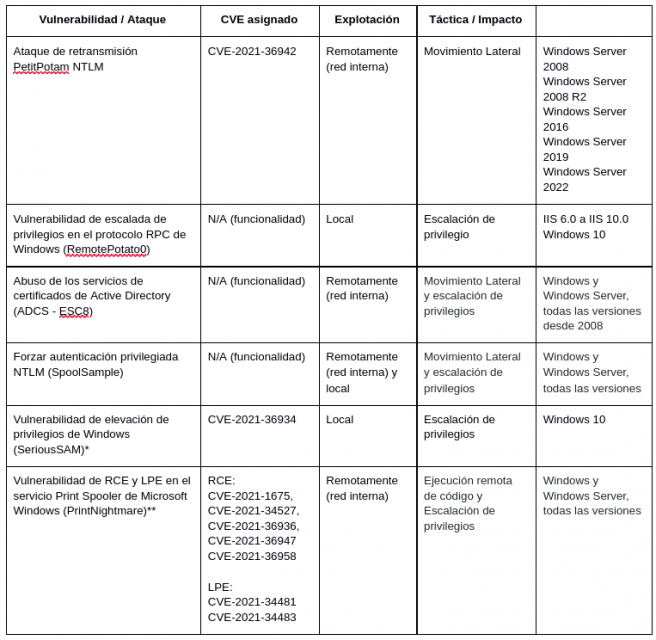 En las últimas semanas se han descubierto diversas vulnerabilidades críticas y nuevas técnicas de ataque a diversos componentes de sistemas Windows. La mayoría de estas vulnerabilidades y ataques se han documentado en entornos en su configuración por defecto y se deben a debilidades o fallas de diseño.