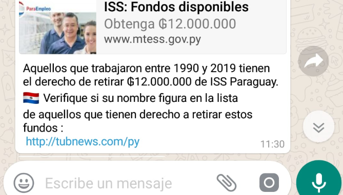 Nuevamente se ha detectado una oleada de engaños mediante mensajes de Whatsapp, esta vez fue con un anuncio de dinero disponible en nombre del Ministerio del Trabajo.